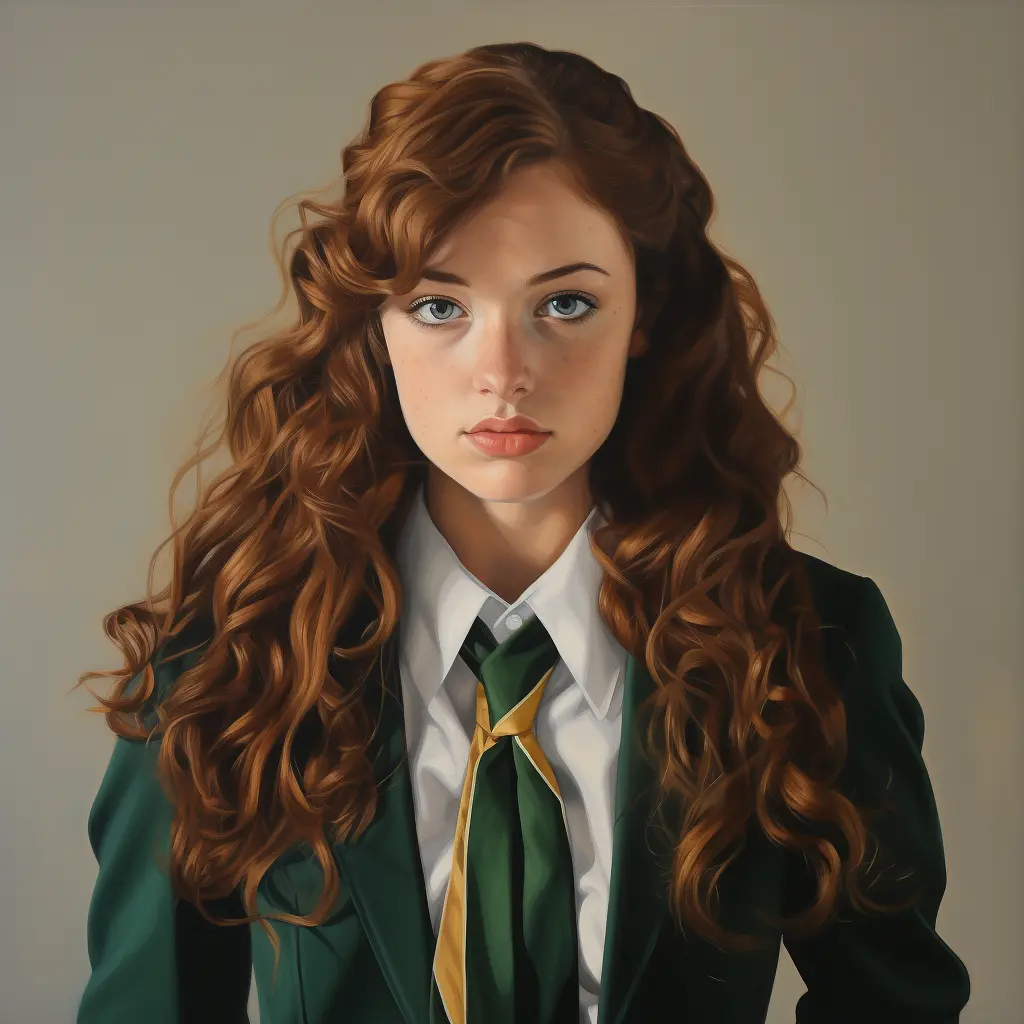 a painting of a teenage girl with very long light brown wavy hair with curls, with bangs and tan skin and bows in her hair, wearing a white blouse and green suit jacket, green tie, school uniform, pouting, portrait style, plain background, with emerald and gold