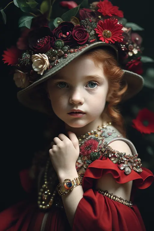 Little girl in chanel on vogue magazine, cute red haired boy, art by Rachel Ruysch ultra highly detailed, detailed American-Style digital painting, highly detailed, intricated, intricated pose, clarity, high quality, dark background, 1, insanely detailed and complex, dramatic setting, hypermaximalism, elegant, ornate, hyperrealistic, dramatic, digital painting, art station, smooth, clear focus, illustration, works by artgerm, greg rutkowski and alphonse mucha, HD