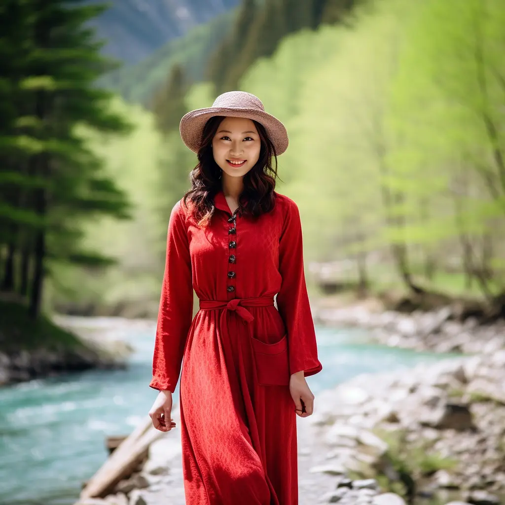 A 40+ young Chinese woman, wearing a bright red long-sleeved dress, is walking in Jiuzhaigou Valley, Sichuan Province. She is elegantly dressed and wearing a hat. Her facial features are delicate and slightly wrinkled. The subject is human. The background is Jiuzhaigou Valley, Sichuan Province. The road is full of spring. Green fields, open space, natural scenery, blue sky and white clouds, bright light, ultra-high definition image, 32k --v 5.2
