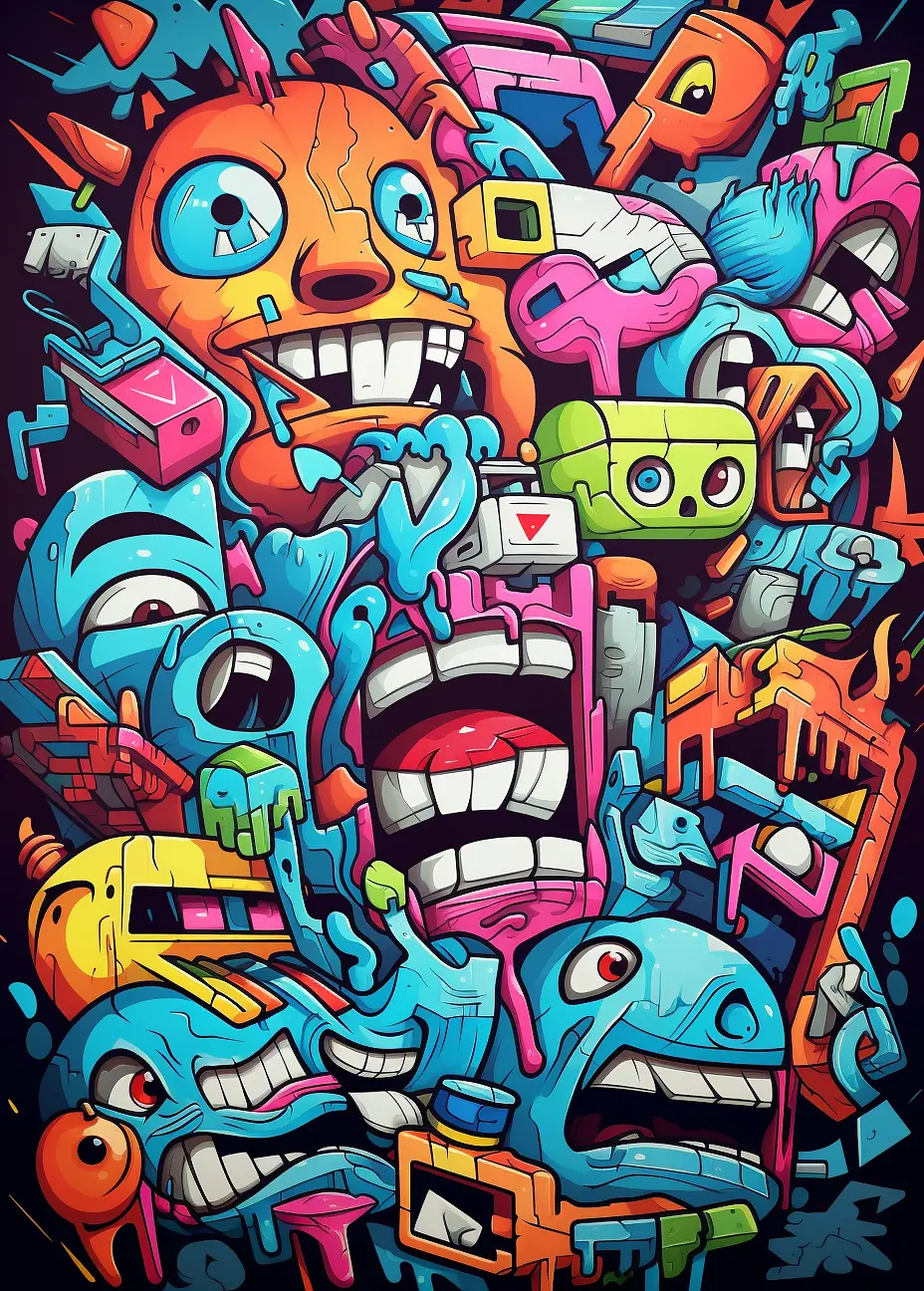 a hand drawn image of a cartoon showing various pictures with faces, in the style of graffiti-inspired geometric abstraction, el Pez, ben wooten, detailed penciling, #screenshotsaturday, shiny eyes, hand-coloring, silkscreen --ar 60:83 --v 5.2 --q 2