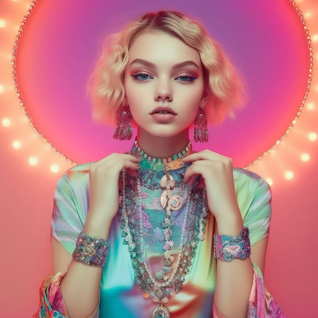 Create a non realistic trippy dreamy studio hq photoshoot for Retro fashion on mint pink background with a paper texture of a Psychedelic art Numero Magazine style High-quality photoshoot style Soft psychedelic style accessories Vintage vibe rhinestone jewellery Rich Embroidered details Velvet fabrics with rhinestones Trippy visuals Acid-inspired colors