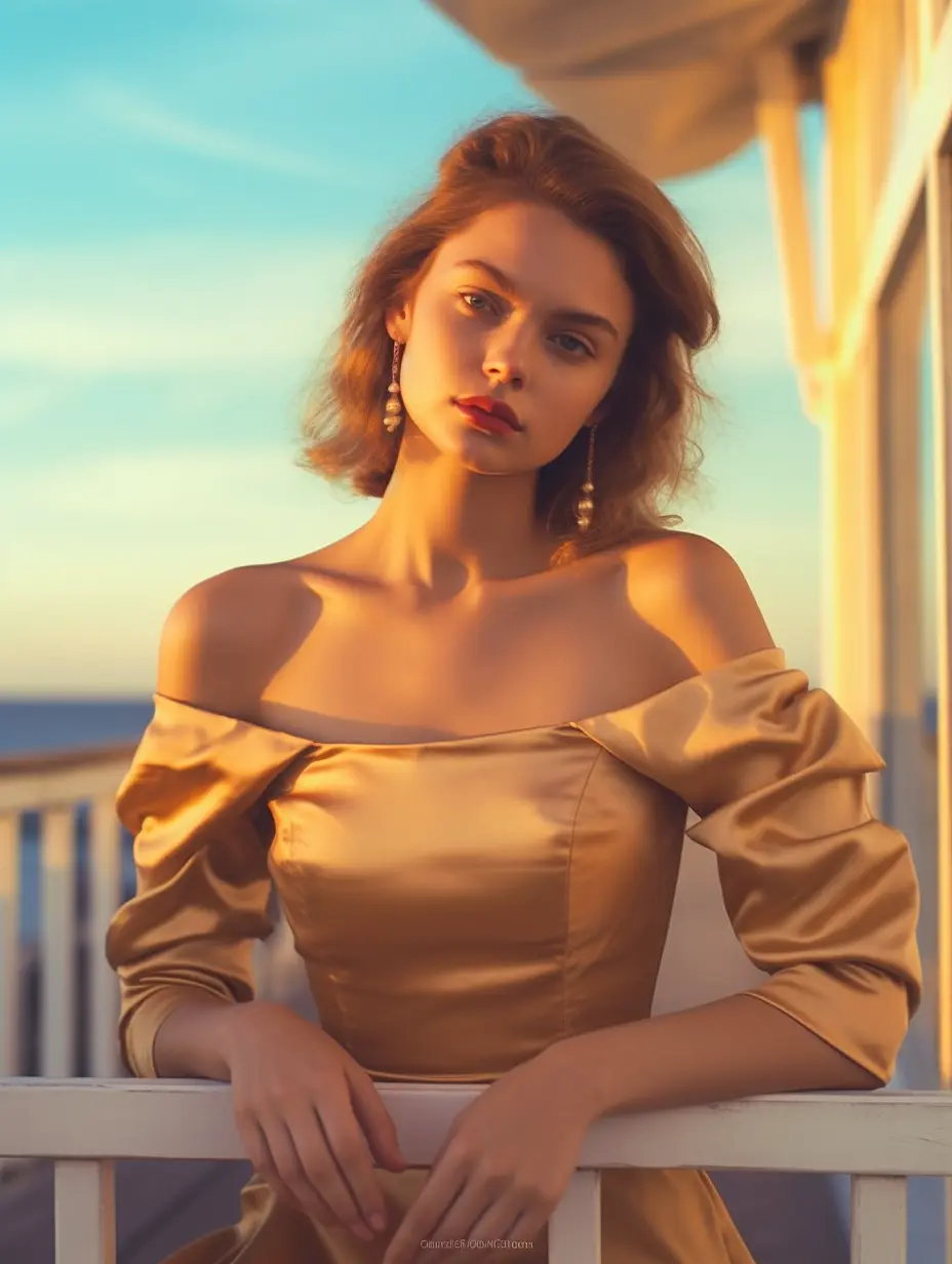 gorgeous attractive young woman in a vivid off-the-shoulder satin one-piece bodysuit, incredible texture detail,, elegant romantic aesthetics, dreamy ethereal glow, Maxfield Parrish, Oleg Oprisco, Wes Anderson --ar 3:4 --s 100 --style raw --c 15