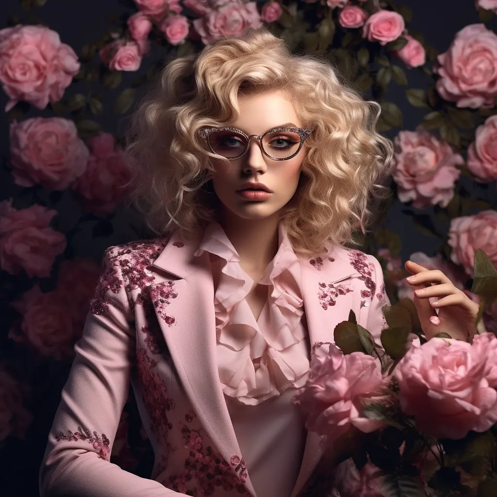 a woman wearing glasses with flowers and tigers on her wall, in the style of glamorous hollywood portraits, light magenta and pink, 32k uhd, deconstructed hot pants tailoring, dramatic lighting effects, nyfw-inspired, modern jewelry --ar 1:1