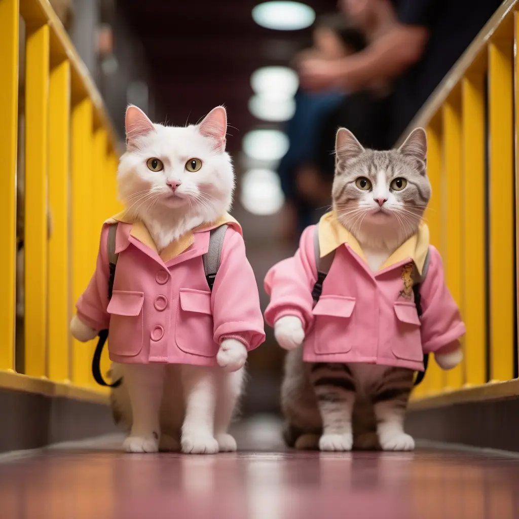 two cats in jackets wearing yellow schoolbags on the aisle of the bus,Wearinocute school uniforms, standing and walking on both feet, one of them is wearinga white shirt, with its paws on the railing, and the other is wearing a pink sweater,high quality photo --ar 1:1 --v 5.1