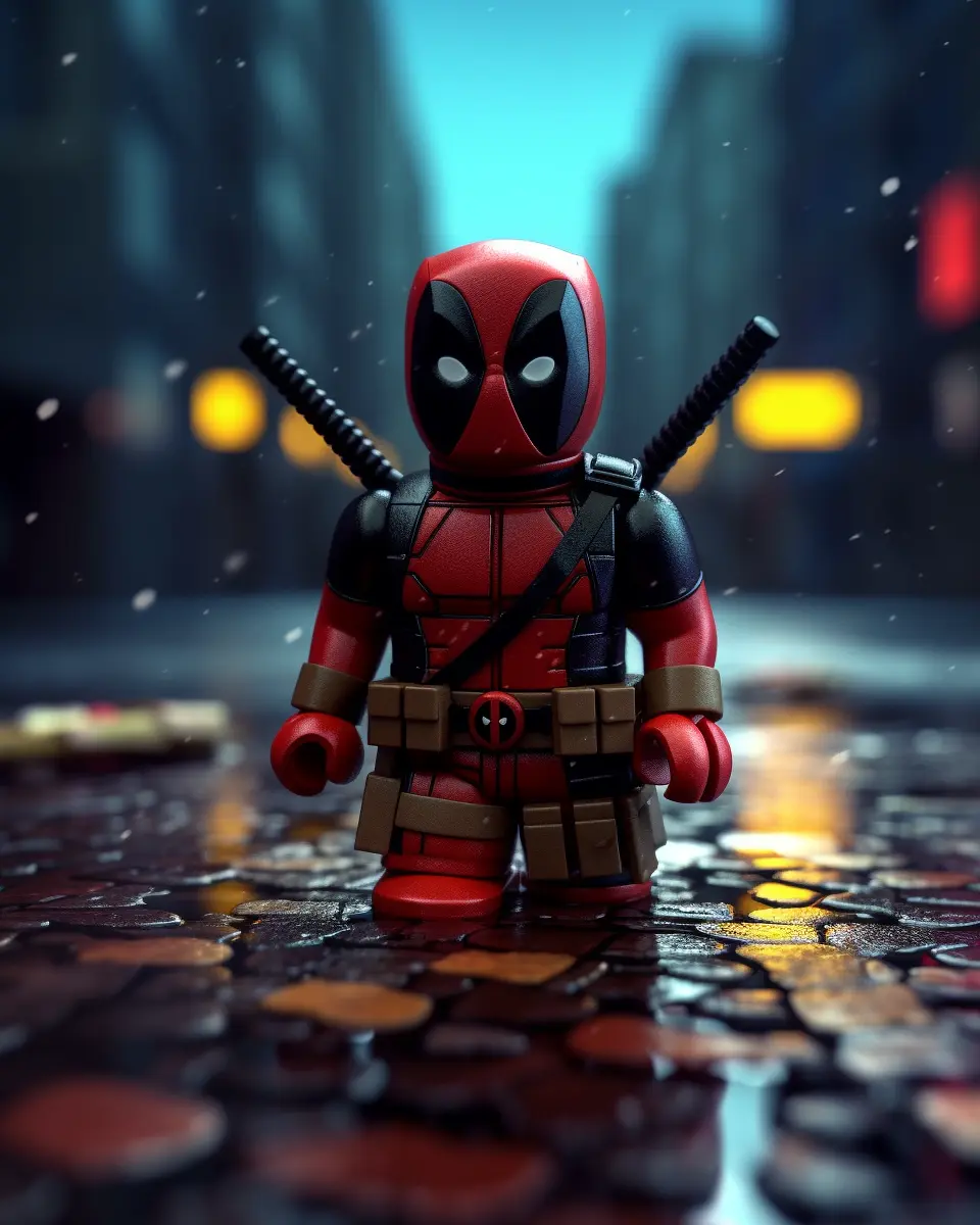 Lego Deadpool ultra sharp focus on the eye. Realistic legs, realitic paws, 4 visible legs, realistic tail. High - sharpness, facial - symmetry, depth - of - field, golden - hour, ultra - detailed photography, Epic beautiful scene, cinematic, post production, depth of field, cinema photography, cinema, color grading, dark stormy sky, professional color grading, Beautiful back Lighting, Accent Lighting, Global Illumination, Lumen Global Illumination, Screen Space Global Illumination, Ray Tracing Global Illumination, Optics diffusion, Ambient Occlusion, Scattering, blurry background, Glowing Deep Shadows, Rough, Shimmering, Ray Tracing Reflections, Lumen Reflections, Screen Space Reflections, Diffraction Grading, Chromatic Aberration, CGI, VFX, SFX, insanely detailed and intricate, hypermaximalist, elegant, hyper realistic, super detailed, exquisite detail, 30 - megapixel --q 5 --style raw --v 5.1 --s 750 --ar 4:5 --q 2 --style raw --v 5.1 --q 2 --style raw --q 2 --style raw --q 2 --style raw --v 5.1 --s 750