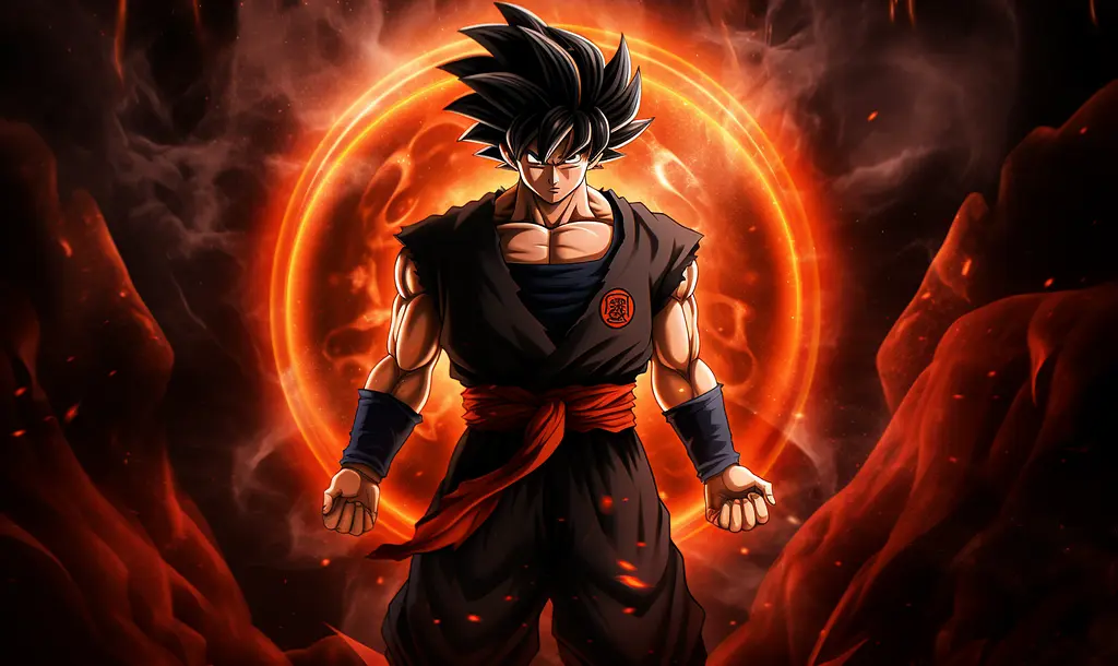 goku on black wallpaper anime wallpapers, in the style of dark amber and red, realistic and hyper-detailed renderings, lively movement portrayal, manticore, flat shading, dynamic and action-packed 16K --ar 5:3 --q 5 --style raw