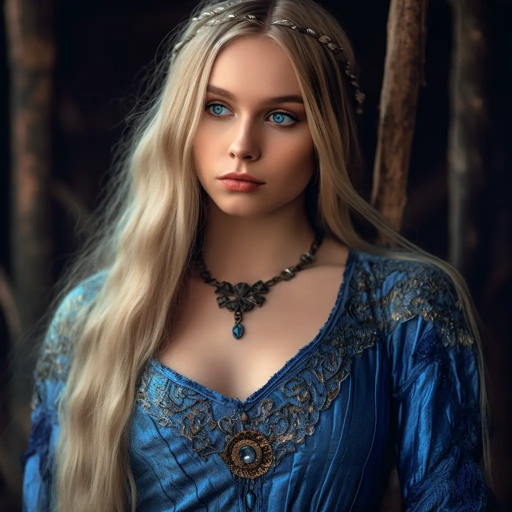 in the style of medieval fantasy art; taken with Canon EOS 5D Mark IV, Canon EF 85mm f/1. 2L II USM, ISO 100, f/1. 2, shutter speed 1/100; full body portrait of beautiful ethereal young woman, vivid blue eyes, mix of Alice Eve and Aimee Teegarden, long curly strawberry blonde hair, wearing a purple and gold dress, huge massive lips, symmetrical face, Realistic textured Skin, outdoors, half body pose, sun light shining through hair, back light, sunlight in back, ultra realistic, highly detailed, deviant art, depth of field, DSLR, Bokeh, crisp sharp shadows, ultra photo realistic portrait, octane render, VRAY2, ray-tracing, particle effects, feminine, vanity, luxury --ar 1:1 --s 500