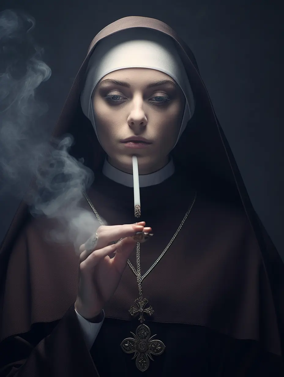 Nun in a diamond necklace smoking a role cigarret, ultra real, realistic,RAW photo, (detailed face)+, digital rendering, gothic art, 80mm, (soft fill light), high detail, sharp focus, aesthetic, 8k uhd, DSLR, intricate details, soft lighting, high quality, --ar 3:4 --q 2 --s 750 --v 5.1 --style raw --q 2 --v 5 --s 750 --q 2 --v 5 --s 750