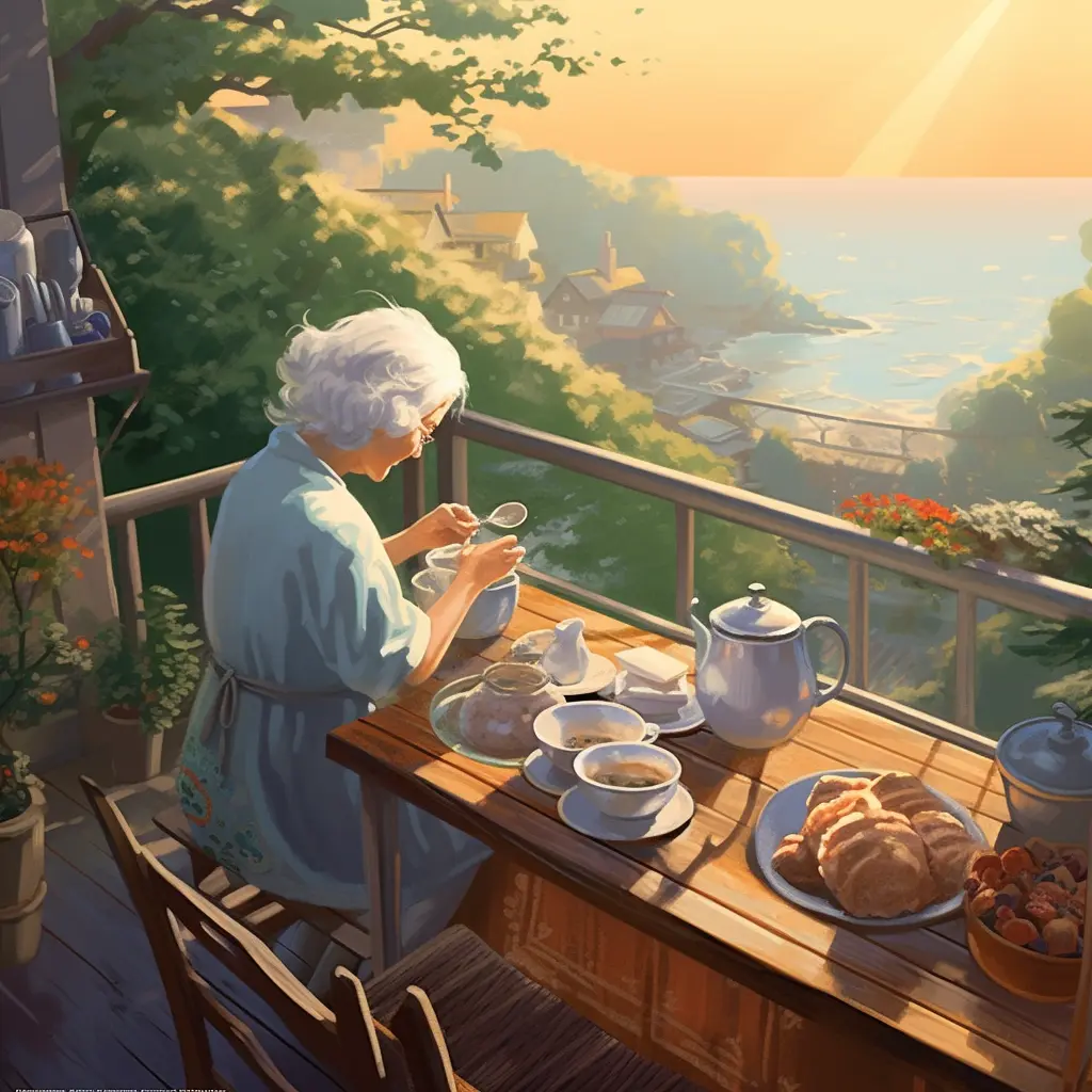 Illustration: On the balcony of a small villa in Germany, a silver-haired grandmother is preparing breakfast for her children. The breakfast is very rich. The distance of the balcony is the forest and the sea
