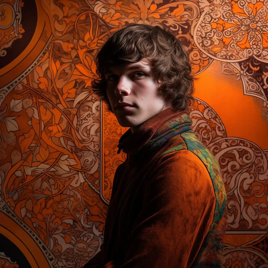a portrait of a young man in bright colors and a pattern, in the style of shepard fairey, dark brown and orange, barry windsor smith, anne mccaffrey, monumental murals, ultra hd, group f/64 --s 250 --v 5