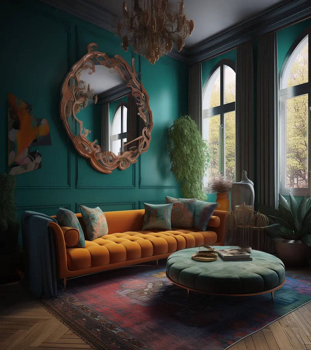 the colorful living room features a colorful sofa, in the style of curved mirrors, bold, cartoonish lines, neoclassical style, filip hodas, moody color schemes, postmodern bricolage, sculptural aesthetics, dark cyan and light amber --ar 140:157 --v 5