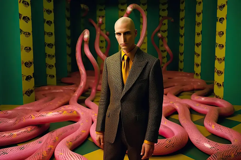 portrait of Lord Voldemort in the style of wes anderson, wes anderson set background, editorial quality, stylish costume design, junglepunk, movie still --ar 3:2 --v 5