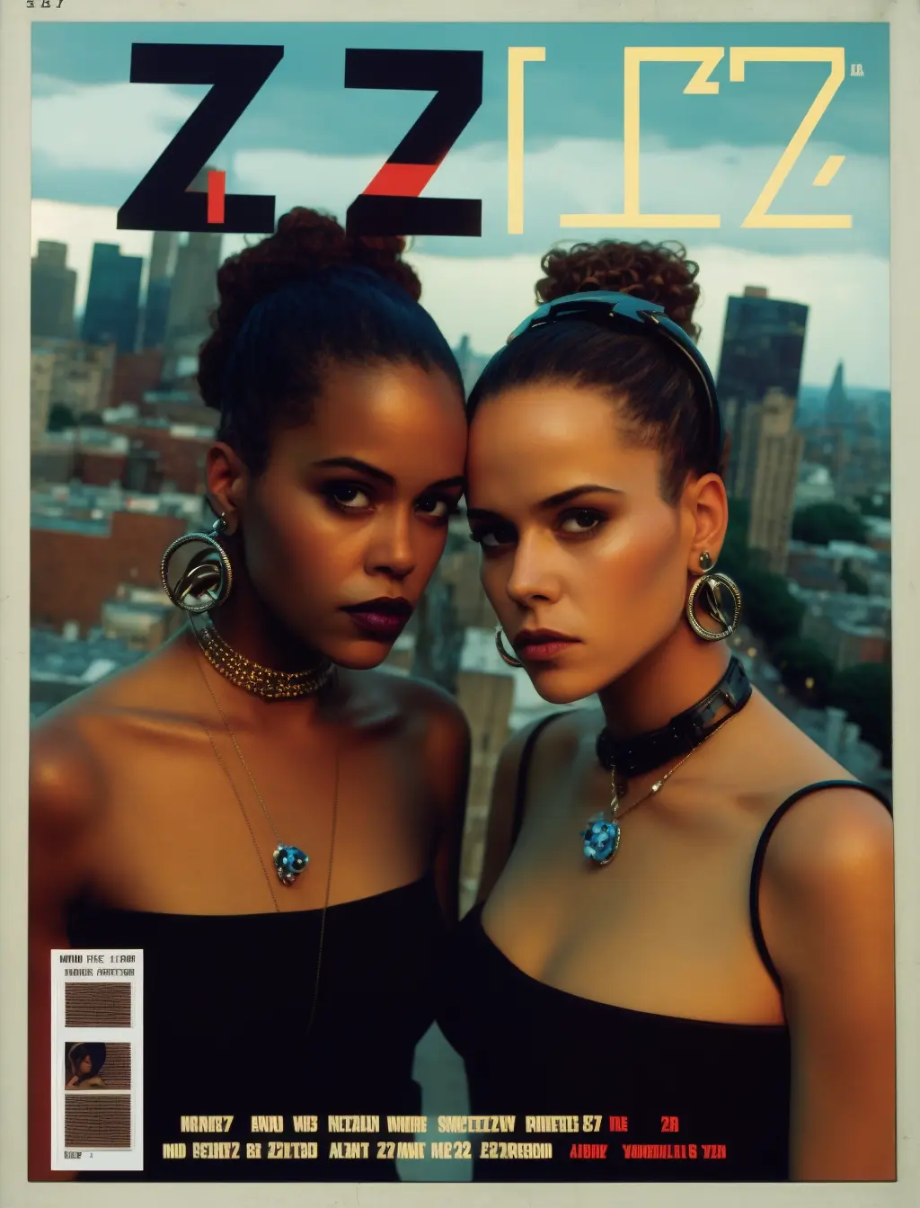 Early 2000s era ZZZ magazine cover, medium frame high-angle two-shot from above, cross-processed film still, capturing a female R&B duo wearing black choker style necklaces and flashy outfits with smoldering stares and hoop earrings, sharp focus, soft low lighting, new york rooftop overlooking the city, playful yet soulful, R&B vibes , 4k, detailed --ar 17:22