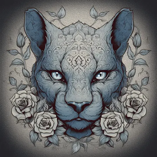 all gray sphynx lion with blue eyes with classical roses elements emanating from center of face, woodcutting template, decorative design, classical ornament, bilateral symmetry, roses, leaves, flowers, buds, flowering buds, feathers, negative space, highly detailed f/64 --s 250 --v 5