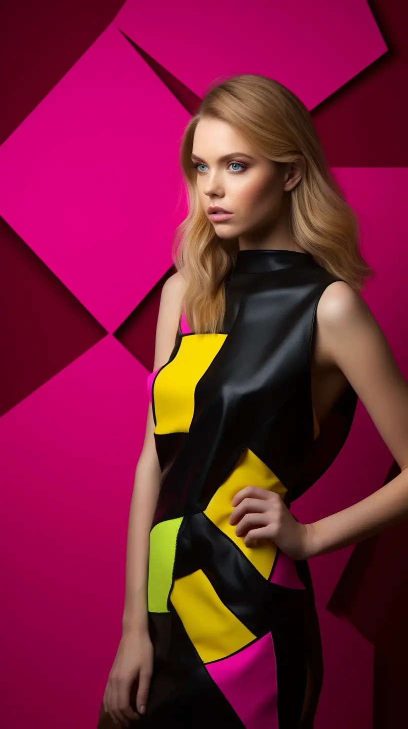 Model in yellow, color, and black pose, in the style of colorful geometrics, vibrant color - blocking, black - and - white graphic, bright hues, bold yet graceful, graphic rock - inspired compositions, dark pink and light green --v 5 --s 500 --chaos 10 --ar 9:16