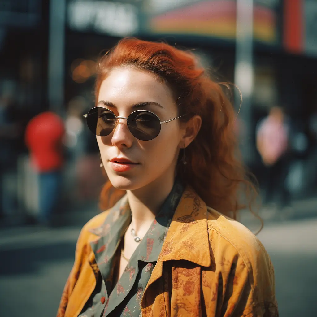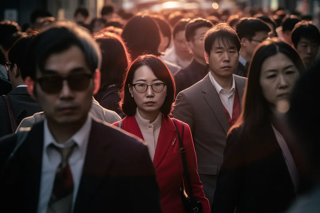 Modern street style photo from above shot on Fujifilm capturing a large crowd of commuters walking through the streets on a moody morning in Tokyo. The sharply focused faces in the crowd are wearing a mix of Japanese streetwear and business attire, but it's the woman in red that commands your attention. The warm glow of the sunrise bursts through the mist, while the sharp sunbeams and careful composition emphasize the emotions in the crowd, and elegance of the woman in red. --ar 3:2 --v 5