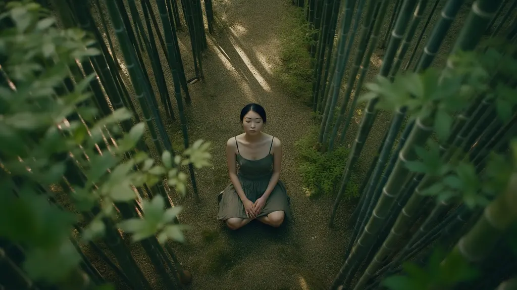 A drone shot from high above, A Japanese young idol, short hair girl mediating, wearing a V neck top, eyes closed and feeling zen and peaceful, sitting cross-legged in a bamboo forest, perfect skin texture, immersed in a zen vibe, divine lighting, Portra 800, UHD --ar 16:9 --v 5