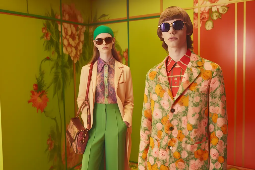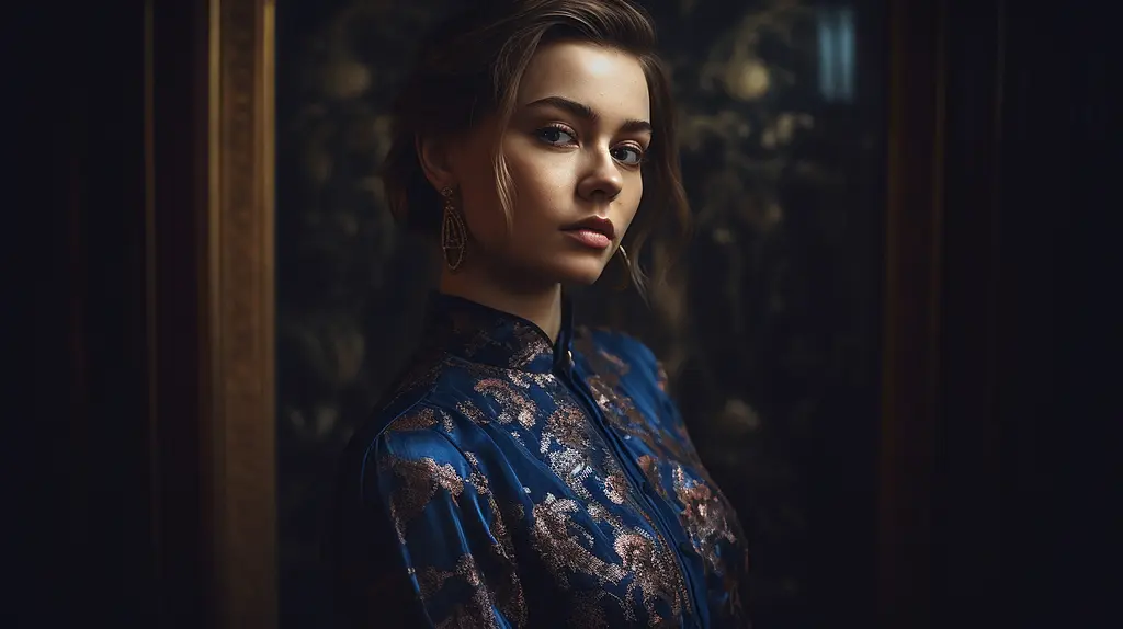 fashion photo of a young woman centered straight shot photo shot on Agfa Vista 400 of a woman dressed in Gucci, wearing an intricate royal blue dress, natural lighting --ar 16:9 --v 5