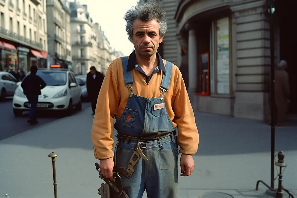 1990s medium-full street style fashion photo shot on Kodak 500T capturing a rugged 50-year-old man with curly gray hair, 5-o'clock shadow, and a stern look walking down the sidewalk on a bright spring morning in Paris. He's wearing worn-down Carhart apparel with a leather carpentry tool belt. Careful composition and morning mist. --ar 3:2 --v 5