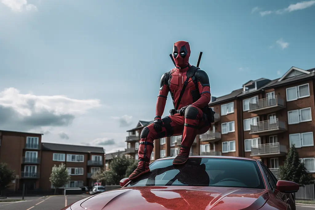 Deadpool wide angle pose on top of a car outside an apartment complex in the uk, canon, vlogger, --v 5 --q 2 --ar 3:2