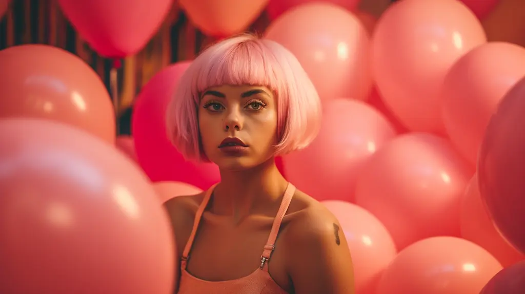 Cinematic, 35mm lens, f/1.8 Fashion Photography 🐯 🍓 , Flirty instagram african influencer, fearful expression, full body shot inspired by WLOP + Sakimichan, wearing a short fit pink latex ultraminiskirt and top, blonde hair, balloons, dreamy, candy colors --ar 16:9 --s 1000 --v 5