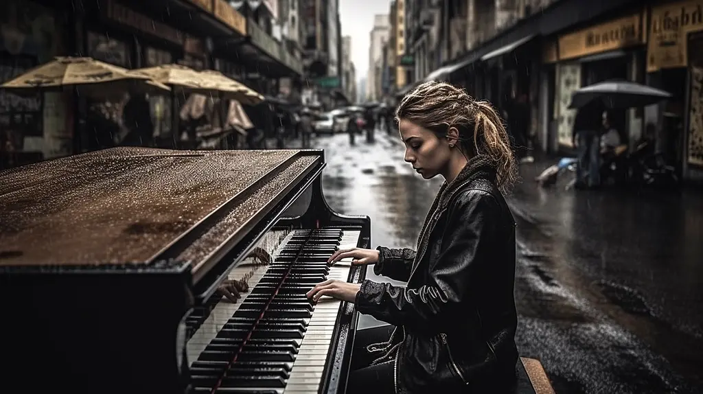 Artist woman playing the piano in the middle of the road ::5 Intense Urban Musician Photography::4 detailed, close-up, sharp focus, traffic jam, Canon EOS R5, f/2.8 aperture, 1/100 second shutter speed, ISO 800, high-quality, award-winning, legendary performer, drone view::3 blurry, dim, generic, plain, grainy::-2 --q 2 --v 5 --s 750 --ar 16:9