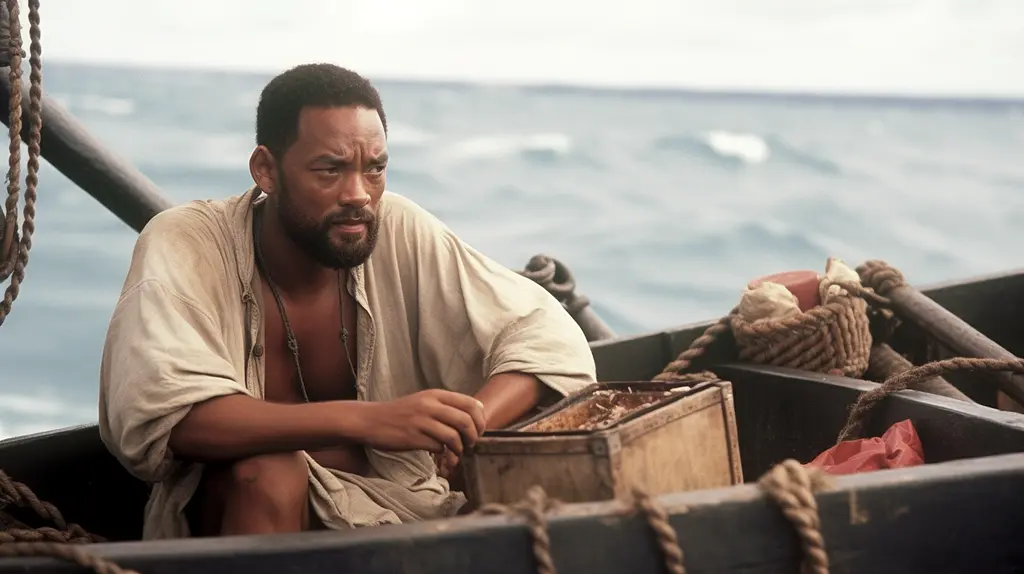 Will Smith as Forrest Gump in Cast Away: Life is Like a Box of Wilsons. --ar 16:9 --v 5