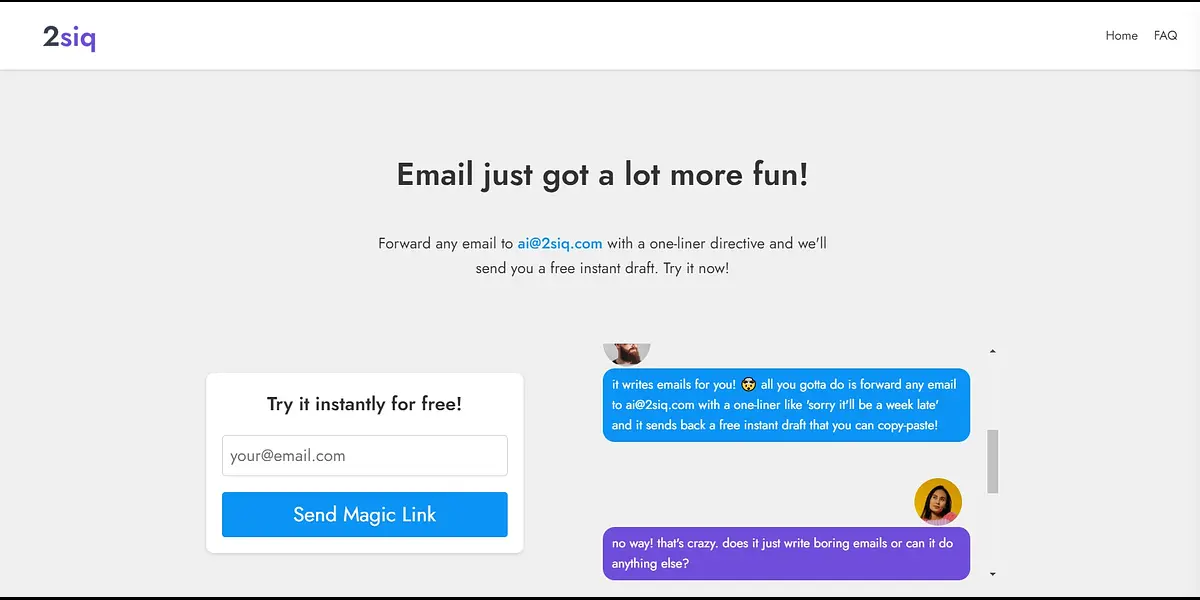 2siq is an effortless and effective way to create exceptional emails for any occasion. With just one line directive, users can forward any email to [email protected] and receive an instant and free draft. No need to worry about subscriptions, app downloads or browser extensions, as 2siq offers seamless simplicity. With the wordsmith wizardry feature, users can say goodbye to writer's block and effortlessly draft thoughtful and impressive emails. For those who need to reply to emails in a foreign language, 2siq's foreign translation capabilities make it easy to bridge the language barrier and connect with people worldwide.