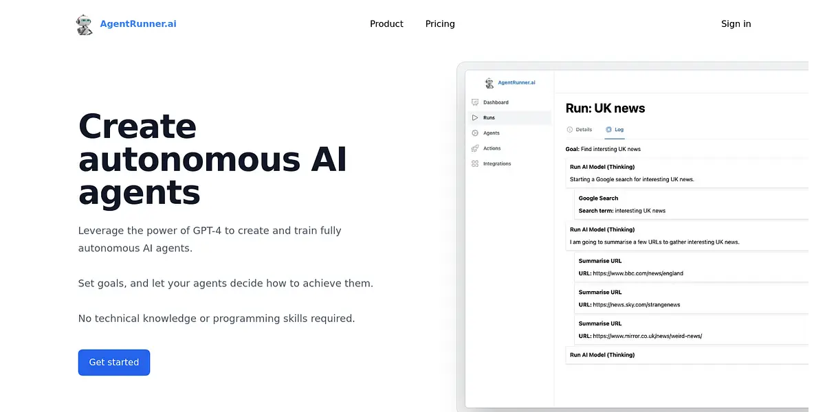 AgentRunner.ai is a novel cloud-based platform that allows anyone to create and train fully autonomous AI agents using the power of GPT-4. This groundbreaking platform empowers users to set goals for their agents and lets the agents decide how they plan to achieve them. The best part? AgentRunner.ai requires no technical knowledge or programming skills, making it available to a broad audience of people.