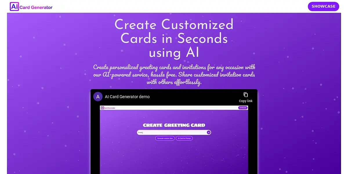 "Create customized greeting and invitation cards in seconds with our AI-powered platform. Choose from a range of personalized options hassle-free and share your creations with others effortlessly."