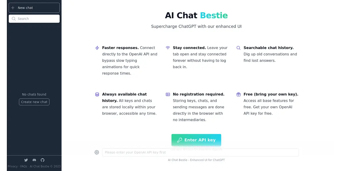 Best of all, AI Chat Bestie is free to use! With the option to bring your own key, you can access all base features for free and get your own OpenAI API key for free as well. So why wait? Start supercharging your conversations today with AI Chat Bestie's enhanced UI for ChatGPT.