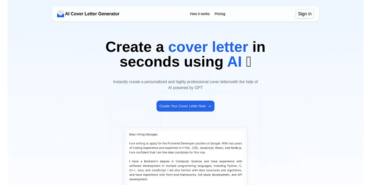Instantly Create Personalized and Professional Cover Letters using AI Powered by GPT