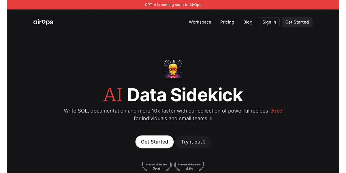 AirOps Sidekick offers a collection of powerful, user-friendly AI-powered SQL recipes that make SQL query writing, documentation, and execution ten times faster. Perfect for individuals and small teams, Sidekick's recipe book includes powerful tools like SQL Fixer, Query Explainer, and Query Writer, among others.