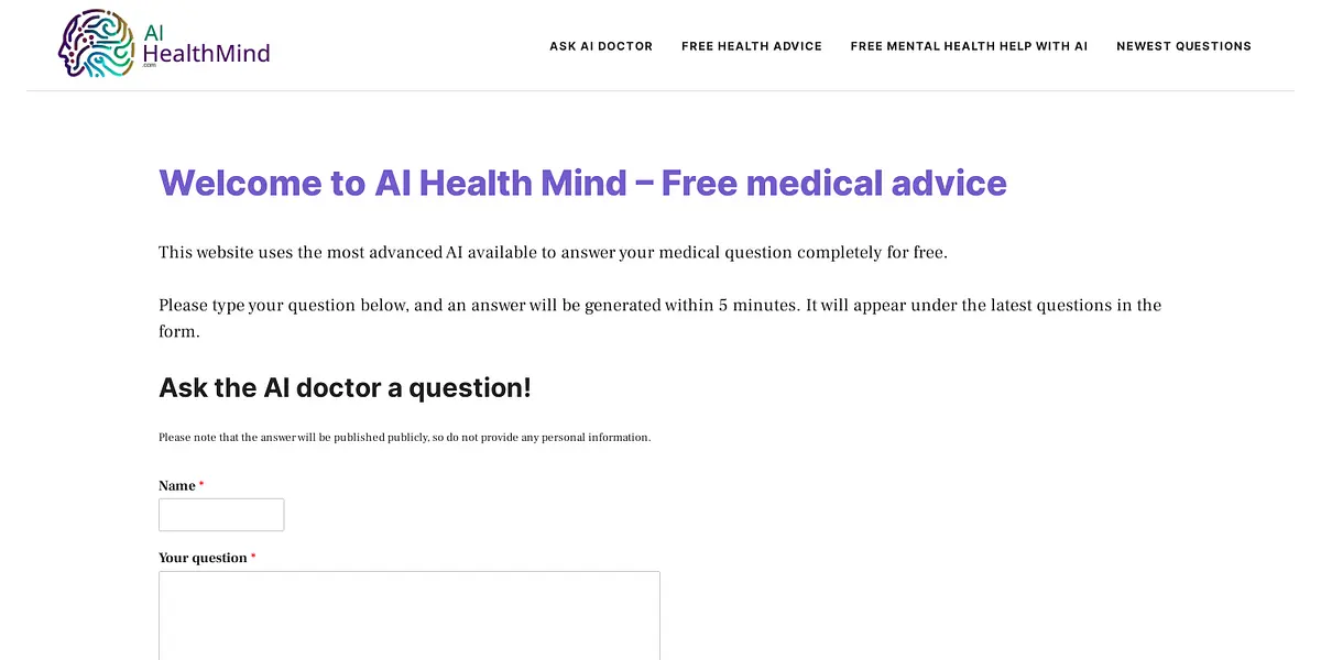 "Get instant, reliable medical advice backed by cutting-edge AI technology, absolutely free. Submit a question and our state-of-the-art algorithms will generate an accurate answer in just 5 minutes. AI Health Mind is your go-to source for personalized medical advice."