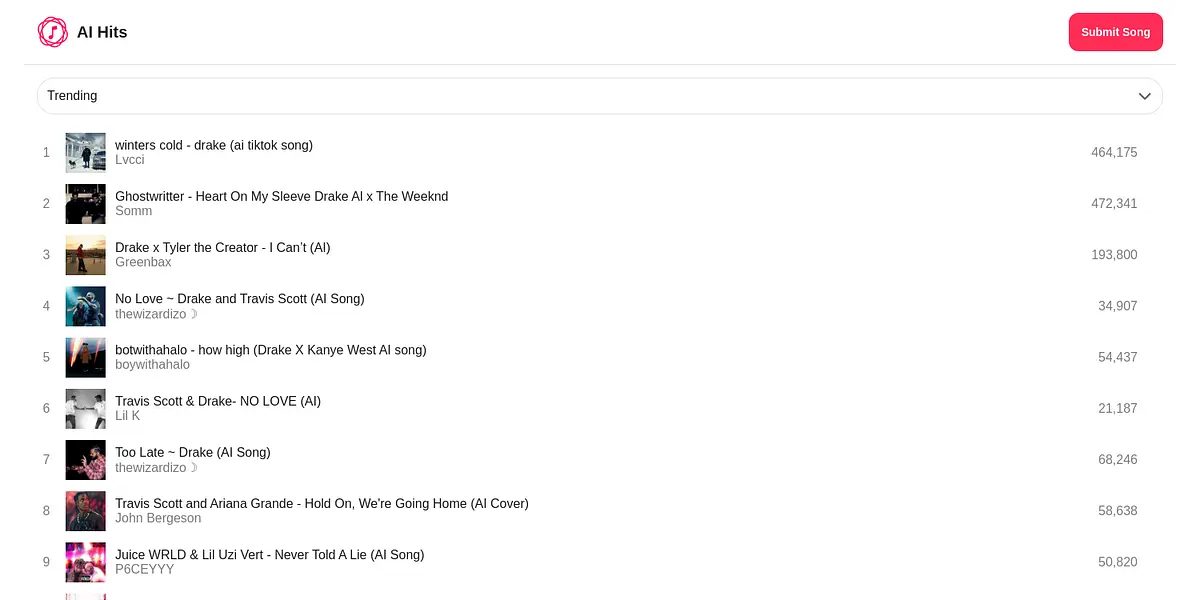 Our platform is a music lover's dream, featuring the latest hit songs generated by AI technology. From Drake and Ariana Grande covers to original compositions, the trending tracks on our website are a must-listen for anyone looking for something new and exciting. Our user-friendly platform makes it easy to navigate and discover the top songs of the week, month, or all-time. As AI technology continues to evolve, we are excited to share the latest and greatest hits that only exist because of it. So why wait? Discover a new favorite song today on our website!