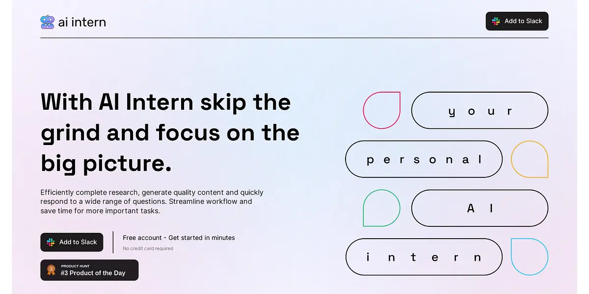 AI Intern is an AI-powered productivity assistant that streamlines workflow and boosts content creation. With its assistance, users can efficiently complete research, generate quality content, and quickly respond to a wide range of questions. AI Intern helps you save time for more important tasks, all while keeping your content on-brand and highly engaging.