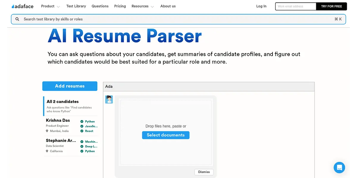 With Adaface's AI-powered resume parser, you can easily upload resumes, ask questions about candidates, and get comprehensive summaries of their profiles, including their skills, work experience, education, and much more. This capability enables you to figure out which candidates would be best suited for a particular role, helping you find the perfect fit for your team.