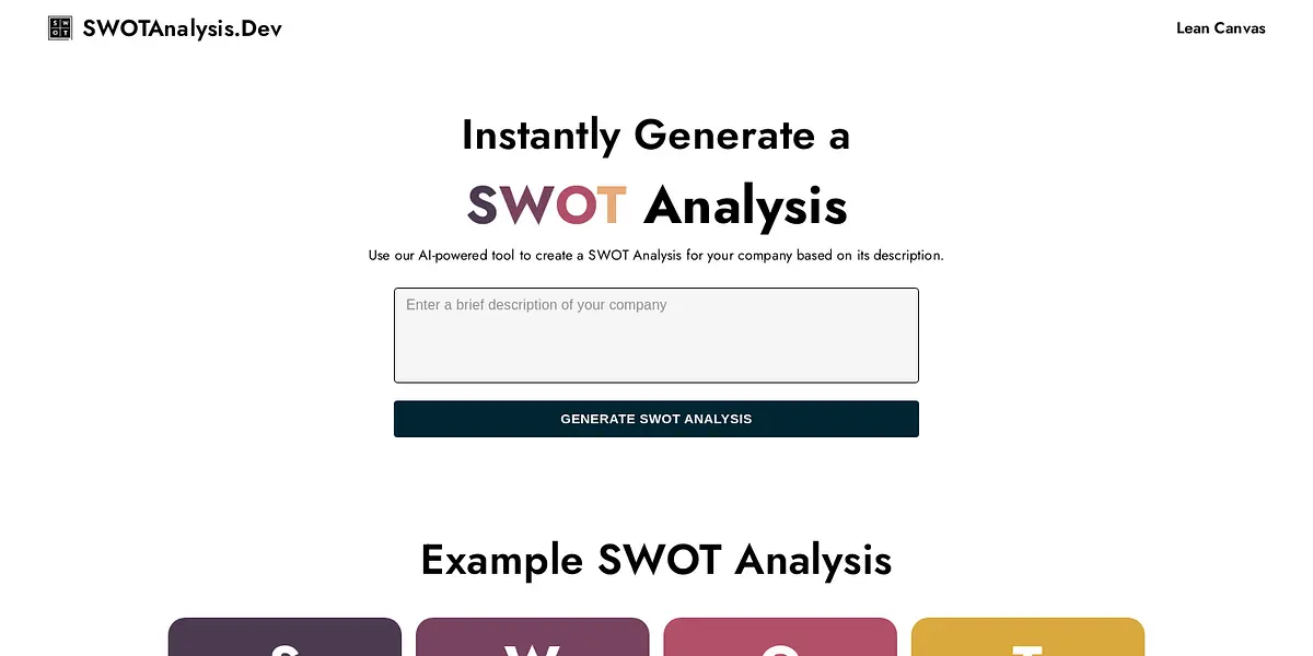 Evaluate your company's strengths, weaknesses, opportunities and threats with SWOTAnalysis.Dev. Our AI-powered tool generates a comprehensive SWOT Analysis in seconds using your company's own description.