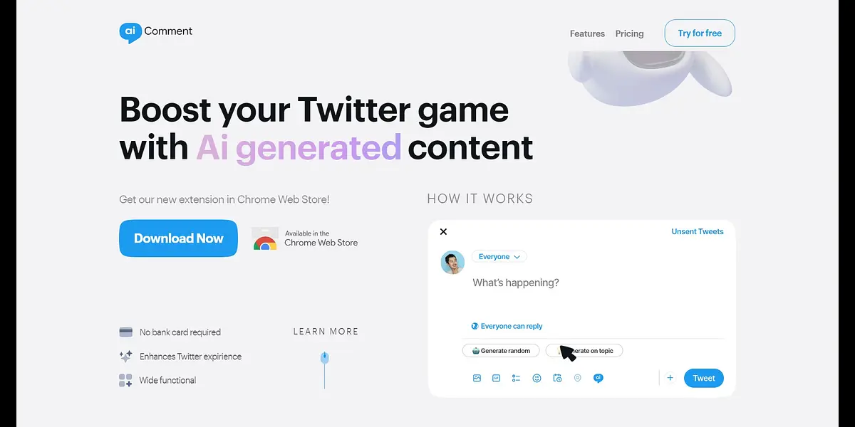 AICOMMENT.PRO is a smart comments generator that uses advanced artificial intelligence technology to analyze your social media post and generate personalized, high-quality comments that will engage your audience. With AICOMMENT.PRO, you can say goodbye to generic and uninspired comments and hello to thoughtful and engaging responses that will help you build a stronger online presence. Whether you're an influencer, business owner, or just looking to improve your social media game, AICOMMENT.PRO is the perfect tool to help you stand out and connect with your audience on a deeper level. So why settle for generic comments when you can have personalized, AI-generated responses that will take your social media game to the next level?