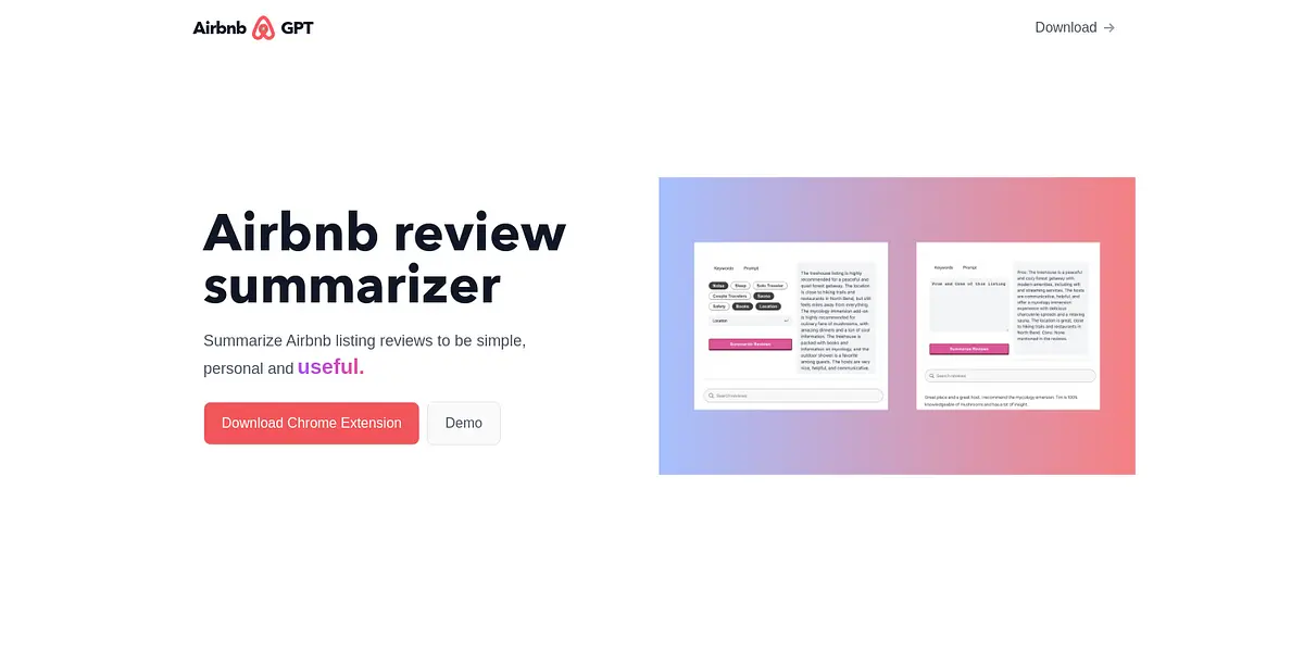 Download the Airbnb GPT Summarizer Chrome Extension to turn lengthy Airbnb listing reviews into short, personal and useful summaries. Simplify your search for the perfect Airbnb stay with just a click of a button.
