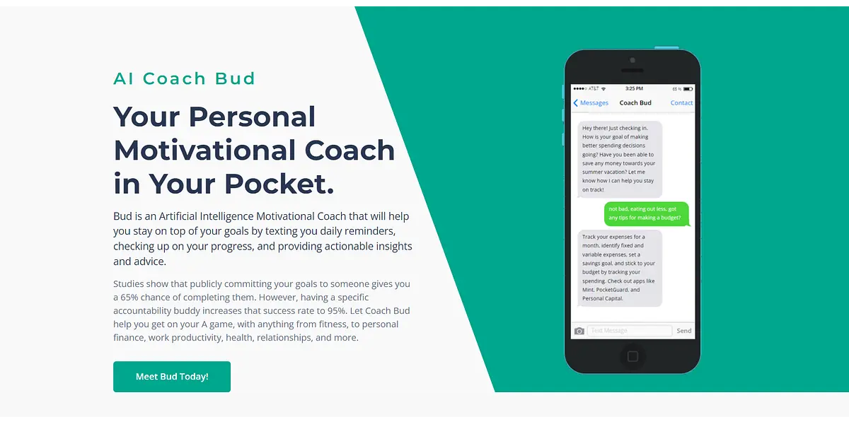 Are you struggling to stay on top of your goals and need some extra motivation? Meet AI Coach Bud, your own personal motivational coach that's available 24/7, right in your pocket. Bud is an Artificial Intelligence Motivational Coach that will help you stay on track with anything you want to achieve.