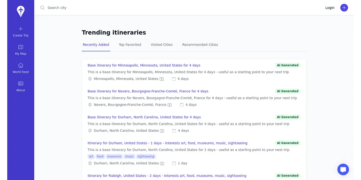 My Map World Feed is a website that offers an excellent platform for individuals seeking to explore new travel destinations or those with a passion for travel. It provides customizable itineraries for various cities and countries around the world, allowing users to discover and plan their next adventure with ease. With its AI-generated base itineraries, users can use these as a starting point and customize them to fit their preferences and interests. My Map World Feed helps users by providing the most comprehensive and curated recommendations for various activities, from art and history to food and sightseeing. Furthermore, it offers a platform where users can upload and share their own experiences, whether it be a personal itinerary, a favorite restaurant or a unique accommodation recommendation. My Map World Feed is the ultimate destination for travel enthusiasts looking to create unforgettable travel experiences.