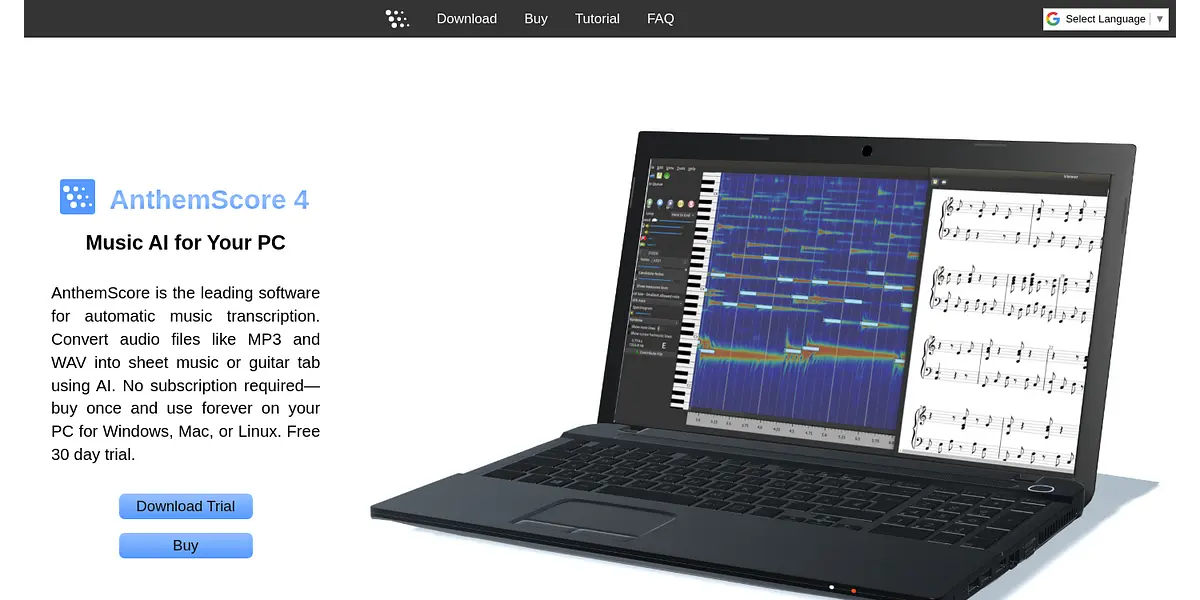AnthemScore 4 is a powerful software that uses AI to automatically convert audio files into sheet music or guitar tab. It's an efficient tool that saves time and is available for Windows, Mac, or Linux with a free 30-day trial.