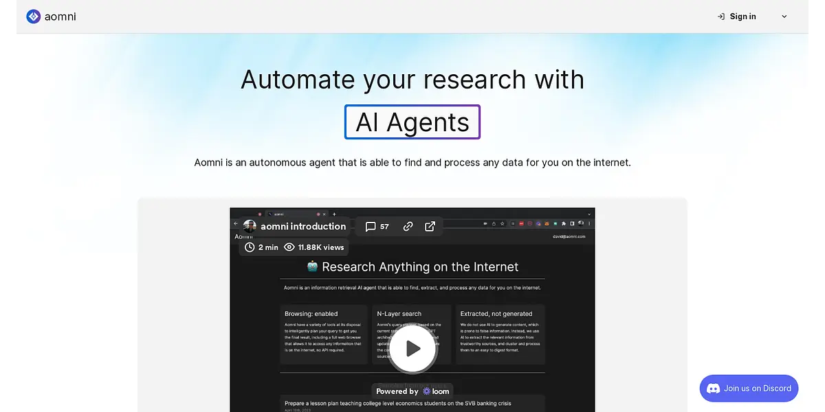 Aomni is a revolutionary autonomous agent that simplifies research by finding and processing data on the internet using advanced AI models by OpenAI. Whether you need to summarize the top three AI news of the week or generate a detailed list of responsibilities for BDR and SDR roles, Aomni has got you covered. With an intuitive interface and a variety of tools, including a full web browser, Aomni streamlines research by utilizing AI to extract relevant and trustworthy information from multiple sources. Unlike other platforms, Aomni does not use AI-generated content, which is notoriously prone to false information. Instead, it focuses on AI-powered data extraction and clustering, making information easy to digest. Whether you are a researcher, student, or professional, Aomni is the perfect solution for all your research needs.