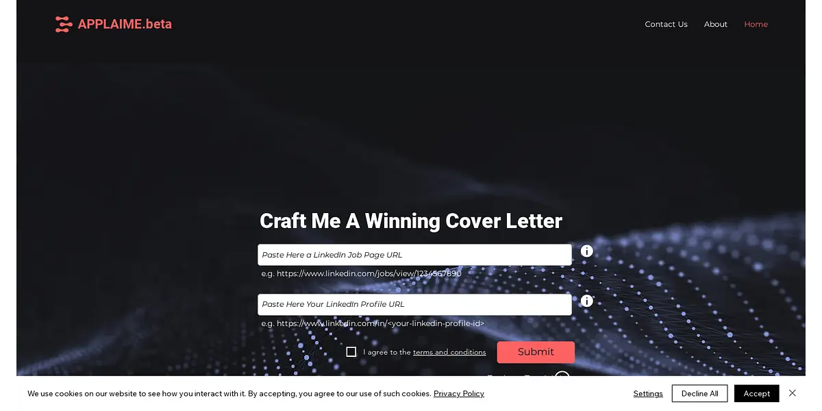 The job search process can be daunting, but APPLAIME aims to make it easier by revolutionizing the traditional concept of cover letter writing. A cover letter is a crucial component of any job application and can significantly impact the hiring process. It gives job seekers the opportunity to make a great first impression and showcase their qualifications, skills, and experiences that align with the company's needs and values. APPLAIME understands this and uses cutting-edge AI technology to craft a winning cover letter tailored to the specific job and company in seconds.
