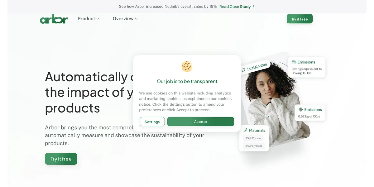 Arbor offers a one-click, fully automated sustainability engine to help businesses measure and showcase the environmental impact of their products. With Arbor's comprehensive product engine, companies can automatically calculate their carbon footprint and showcase positive metrics using trust-worthy data sources. Arbor's reporting is compliant with industry-leading reporting standards and meets legislation requirements. The tool is customizable and scalable to all products, enabling businesses to display their environmental impact easily to their audience. Arbor's powerful product engine enables accurate measurement of a company's supply chain impact from cradle to gate. The peer-reviewed data is sourced from industry recognized databases and LCA studies. The engine is designed for sustainability scale-up efforts and helps businesses accelerate the transition towards sustainable e-commerce. Arbor offers a free trial to help companies experience the automation of their sustainability efforts.