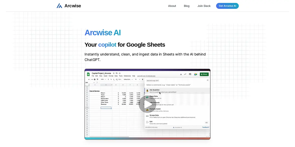 Arcwise AI helps Google Sheets users instantly understand, clean, and ingest data with AI-generated formula suggestions, automated data scraping, and ChatGPT embedded in Sheets. Join 5,000+ users and get a copilot that saves time and improves accuracy.