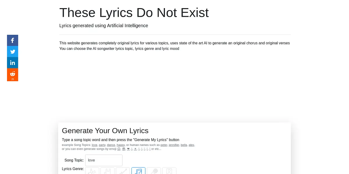 If you're a songwriter, rapper, or freestyler, you know that there's nothing more frustrating than writer's block. Sometimes no amount of coffee, walks, or forced inspiration can break the creative logjam. That was until These Lyrics Do Not Exist, a website that uses state-of-the-art AI to generate unique, original lyrics for any genre, mood, or topic.