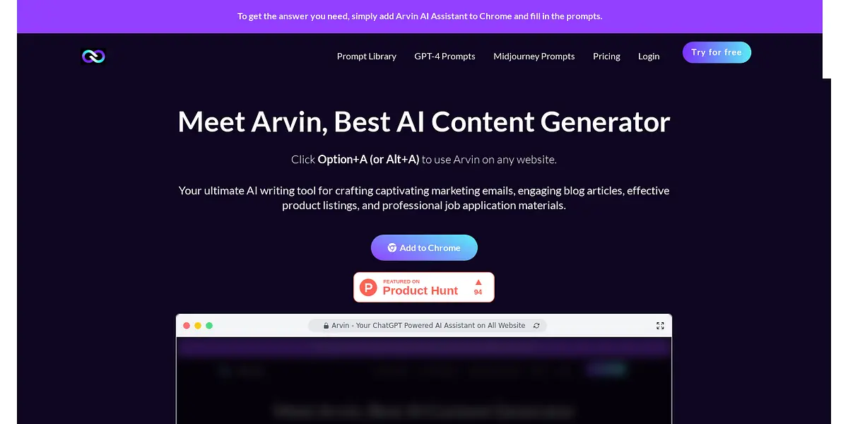 To get started, simply add Arvin AI Assistant to Chrome and fill in the prompts. You can also use the keyboard shortcut Option+A (or Alt+A) to use Arvin on any website. Arvin's prompt libraries offer over 1000 ChatGPT prompts and over 200 GPT-4 prompts that update daily. If you don't know how to generate prompts, you can explore hundreds of Arvin's best prompts to generate marketing campaign ideas or to act as an essay writer.