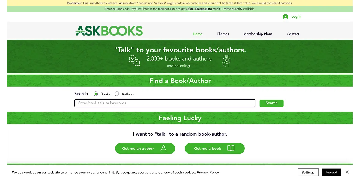 Overall, AskBooks.ai is a fun and engaging way for book lovers to explore their favorite titles and authors, connect with other readers, and get answers to some of their most burning questions. And with a free 100-question credit available to new members who use the coupon code "MyFirstTime," there's never been a better time to sign up and start exploring.